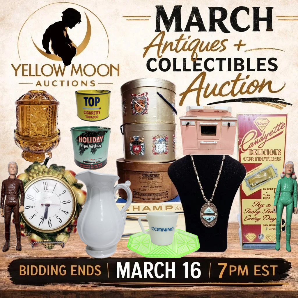 We offer curated online auctions featuring select antiques, collections, and estate items. Created as an extension of Yellow Moon’s long-standing buying and retail business, our auctions provide an opportunity for certain pieces to reach a wider audience beyond our local market.